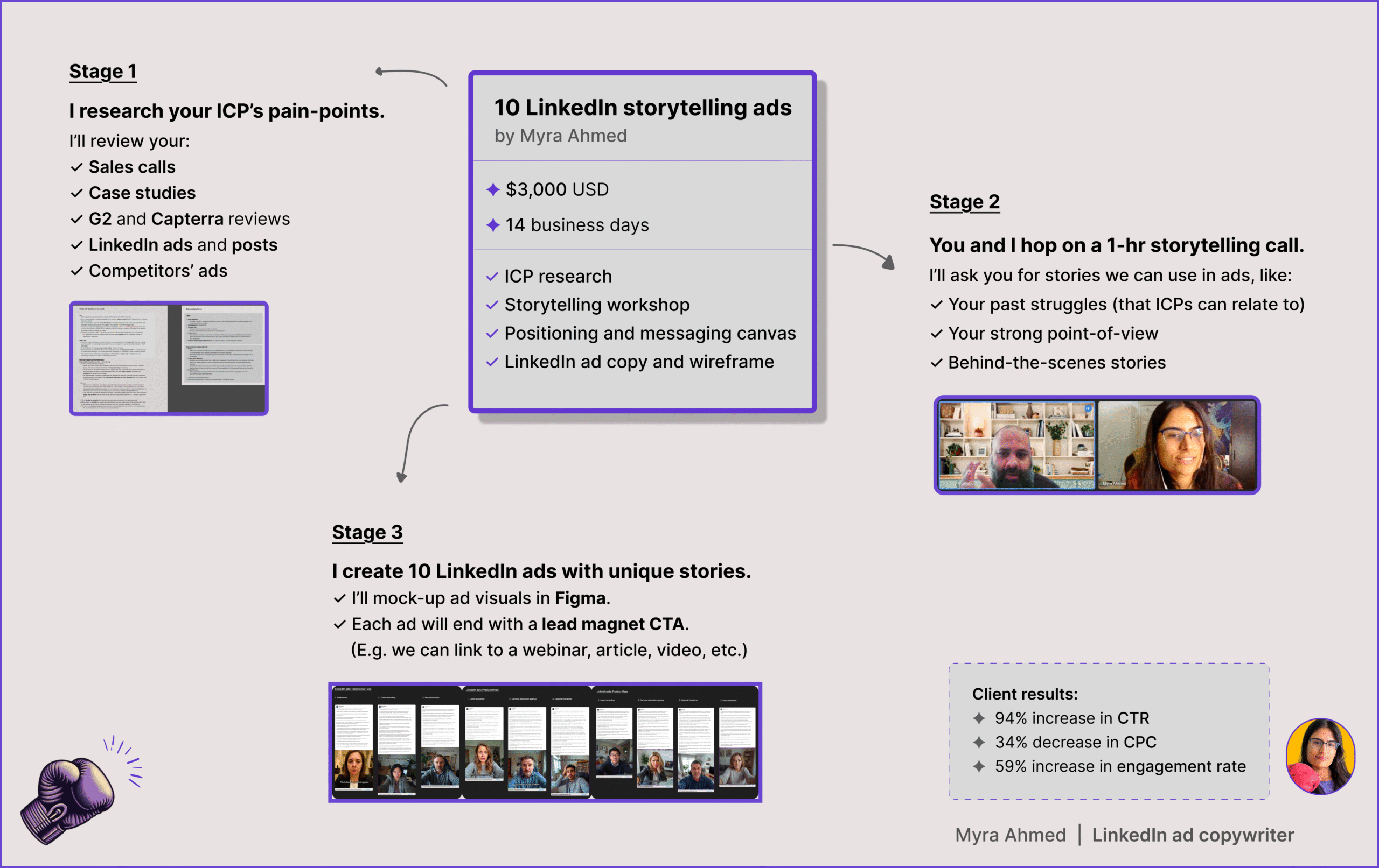 I recommend 10 ads for a a first project with me – it’s enough to give us helpful data insights on which copy resonates with your ICP.